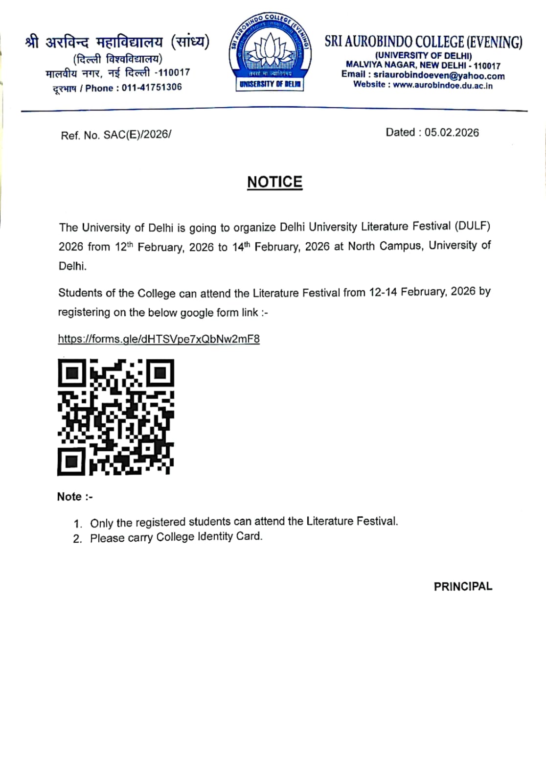 Notice of Students Delhi University Literature Festival (DULF) 2026